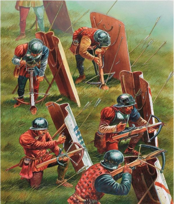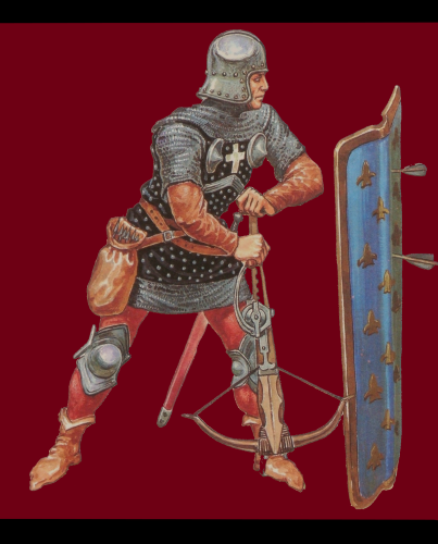 Существуют также подразделения, состоящие исключительно из арбалетчиков и лучников. Они применяют не древковое оружие, а оружие дальнего боя. Однако воины этих подразделений подготовлены к рукопашному бою, оснащены, как и другие пехотинцы, личным оружием и защитными средствами. Арбалет, из которого стреляют короткими массивными стрелами, так называемыми болтами, это очень точное оружие с большой пробивной силой, но, к сожалению, его заряжание и стрельба требуют много времени, поэтому оно более полезно в ходе осады, чем на поле боя, где ситуация может развиваться попросту молниеносно.