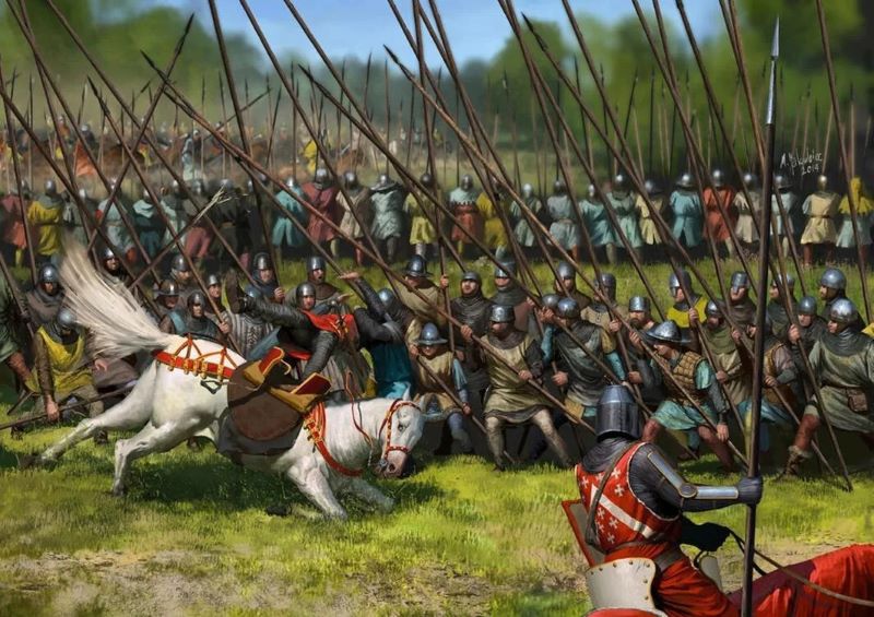 Базовым снаряжением пехотинца также является древковое оружие, тем более что пика длиной в несколько метров позволяет эффективно противостоять атакам кавалерии, когда конник нанизывается на острие пики прежде, чем дотянется до человека, держащего древко.
