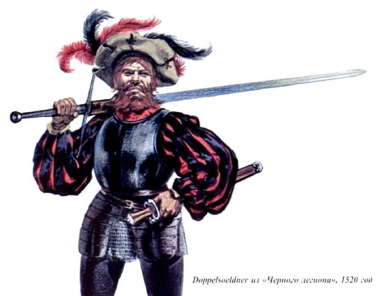 Некоторые пехотинцы, шествующие в дальних шеренгах, орудуют в сражении двуручными мечами длиной до двух метров. На маршах их носят на спине, обмотав тканью или кожей. Это фактически единственный тип меча, который носят таким образом — при таком расположении обычного лезвийного оружия, вытаскивание его из ножен и возврат в них становятся усилием, требующим много времени и внимания.