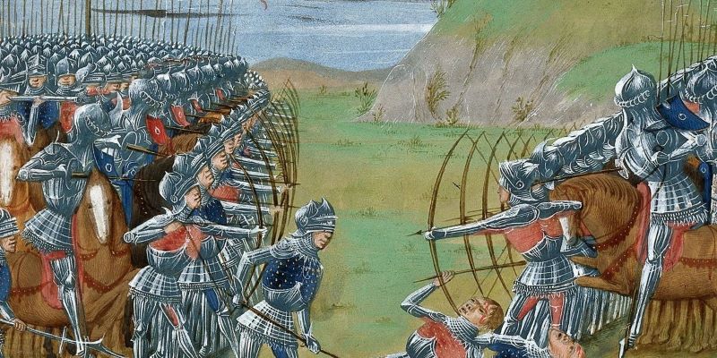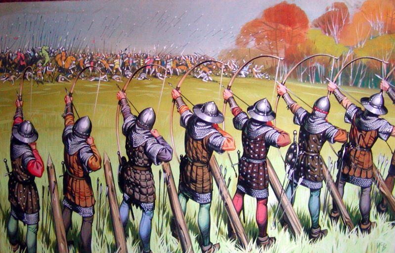 Используемый на войне длинный лук (размером до двух метров) — менее точное, но и более быстрострельное оружие (тренированный стрелок может сделать 10 выстрелов в минуту), по пробиваемости немногим уступающее арбалету. Стрельбу, которую ведет группа лучников, по частоте и количеству запущенных в воздух смертоносных снарядов можно сравнить с очередью из пулемета. И в столкновении с открытой большой массой противника (например, атакующими рыцарями) она приносит аналогичные результаты.