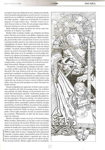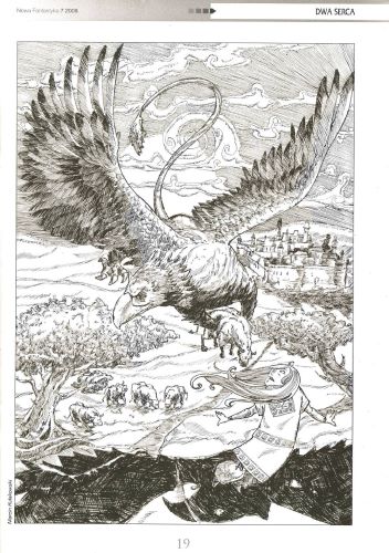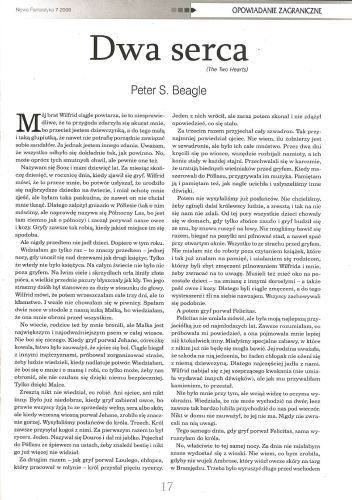 15.1. Рассказ американского писателя Питера Бигла/Peter S. Beagle, который называется в оригинале “The Two Hearts” (2005, ”The Magazine of Fantasy and Science Ficnion”; 2006, авт. сб. “The Line Between”; 2010, авт. сб. “Mirror Kingdoms: The Best of Peter S. Beagle”), перевел на польский язык под названием “Dwa serca/Два сердца” МИХАЛ ВРОЧЫНЬСКИЙ/Michał Wroczyński (это ошибка редакции – на самом деле рассказ перевел МИХАЛ ЯКУШЕВСКИЙ/Michał Jakuszewski) (стр. 17—33). Иллюстрации МАРЦИНА КУЛАКОВСКОГО/Marcin Kułakowski.