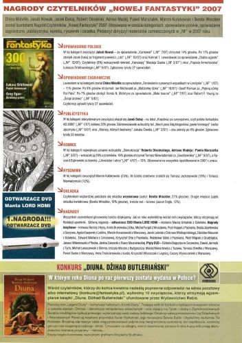 А) В категории «Польский рассказ» — Якуб Новак за рассказ “Karnawał” (“NF” 7/07, 14% голосов). Второе место разделили Яцек Дукай за фрагмент романа “Lód” (“NF” 10/07, 11%) и Конрад Левандовский за рассказ “Diabłlu ogarek” (“NF” 12/07, 11%). Третье место (8%) – Мацей Гузек за рассказ “Koncesja” (“NF” 3/07), Лукаш Орбитовский за рассказ “Popel Armeńczyk”. В анкетах фигурировали 27 наименований.