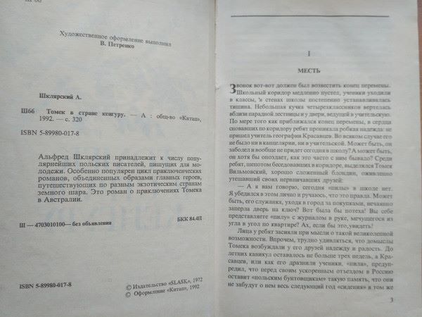 Согласно ФАНТЛАБУ (см. ЗДЕСЬ) в 1992 году книга вновь была переиздана этим же издательством. Не-е, ребята, тут все не так. Книга лишь ссылается на копирайт издательства “Śląsk”, а на самом деле напечатана издательством «Китап» где-то в Украине («А.»? Тираж отпечатан в Симферополе). Текст, в ней, похоже, в переводе И. ШПАК, а вот рисунки отнюдь на Ю. МАРЕКА, а, возможно, В. ПЕТРЕНКО, указанного в качестве художественного оформителя.