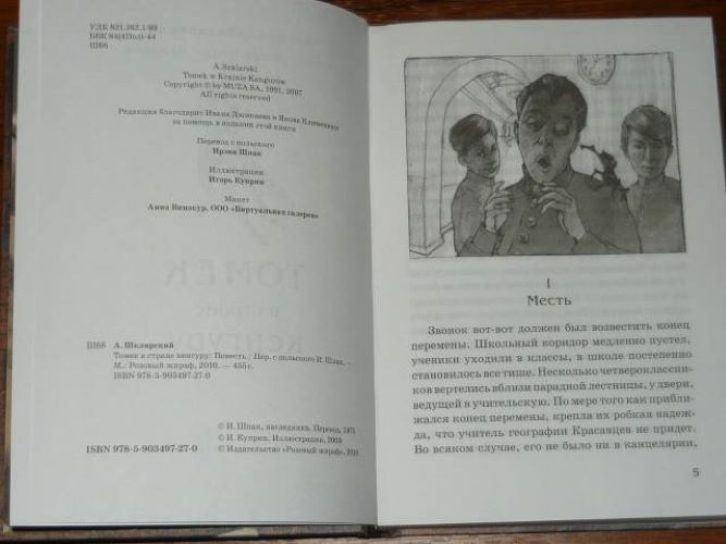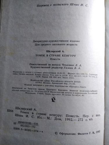Итак, переводы романа на русский язык. Сейчас трудно уже сказать, почему так случилось, но переводами цикла Шклярского на язык великого соседа занялось само родное издательство “Śląsk”. В 1969 году роман “Tomek w krainie kangurów” был им издан под названием «Томек в стране кенгуру» в переводе ИРЕНЫ ШПАК (Irena S. Szpak), в твердом переплете с суперобложкой, с рисунками на обложке и суперобложке и внутренними иллюстрациями, конечно же, ЮЗЕФА МАРЕКА.