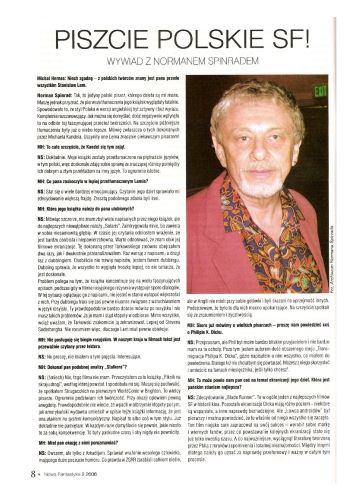 3. Под названием «Пишите польскую НФ!/Пишите польскую НФ!» печатается интервью, взятое Михалом Хернесом/Michał Hernes у американского писателя НФ Нормана Спинрада/Norman Spinrad (8—9). Им мы займемся особо.