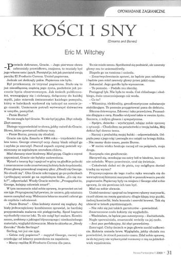 12.3. Рассказ американского писателя Эрика Уитчи/Eric M. Witchey, который называется в оригинале “Dreams and Bones” (2001, ант. “L. Ron Hubbard Presents Writers of the Future”. Vol. XVII), перевел на польский язык под названием "Kości I sny/Кости и сны” ЛУКАШ СОВА/Łukasz Sowa. Иллюстрации ТОМАША ЕНДЖЕЕВСКОГО/Tomasz Jędrzejowski (стр. 31—35).
