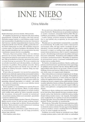 12.1. Рассказ британского писателя Чайны Мьевиля/China Miéville, который называется в оригинале “Different Skies” (2005, 2011, авт. сб. “Looking for Jake and Other Stories”) перевел на польский язык под названием “Inne niebo/Другое небо” ГЖЕГОЖ КОМЕРСКИЙ/Grzegorz Komerski (стр. 17 – 40). Иллюстрации ТОМАША ЕНДЖЕËВСКОГО/Tomasz Jędrzejowski.