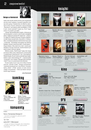1. Под заголовком “Анонсы” (“Zapowiedzi”) напечатан список книжных, кино и игровых премьер, его комментирует Ежи Жимовский (стр. 2).