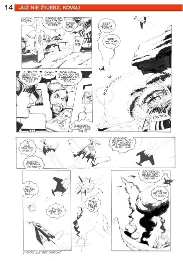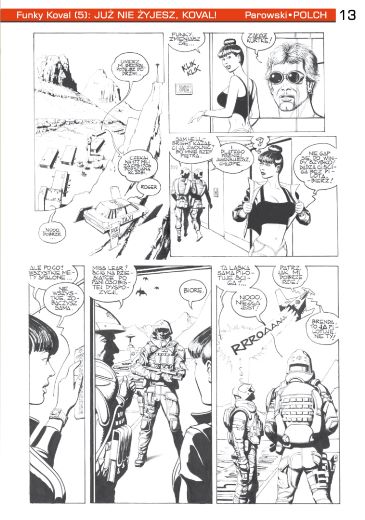 6. Напечатаны дальнейшие четыре черно-белые панели нового «Фанки Коваля» (стр. 13—16). Две из них приведены ниже. Комикс называется “Już nie żyjesz, Koval!/Ты уже мертв, Коваль!”.