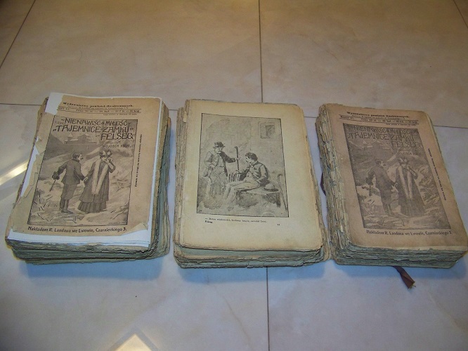 или бульварные брошюры, такие как: «Материнское сердце», «Тернистый путь благородной женщины», «Барбара Убрик, или Тайны монастыря», «40 раз женатый», «Долорес, проданная невеста», «Эльвира, или Кровавые тайны Пекина», «Лидья, дочь графини-нищенки», «Проклятая дочь, эпопея любви и ненависти» ("Serce matki", "Ciernista droga szlachetnej kobiety", "Barbara Ubryk, czyli tajemnice klasztoru", "40 razy żonaty", "Dolores, sprzedana narzeczona", "Elwira, czyli krwawe tajemnice Pekinu", "Lidja, córka hrabini żebraczki", "Wyklęta córka, epopeja miłości i nienawiści") и др. (…)