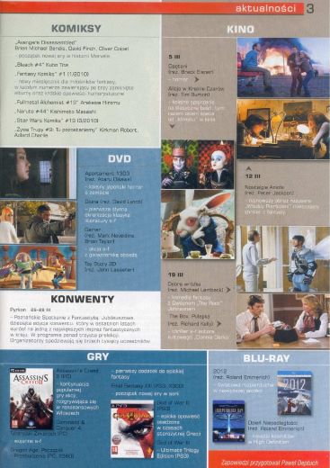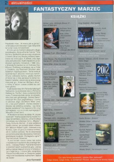 1. Под заголовком “Fantastyczny marzec/Фантастический март” напечатаны списки анонсов – издающихся в Польше книг и комиксов, а также кинофильмов, DVD, настольных и компьютерных игр и телесериалов, даты конвентов (стр. 2–-3). Очень хорошее нововведение – их (эти списки) комментирует Ежи Жимовский.