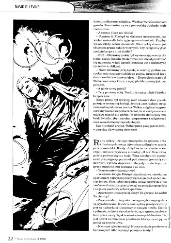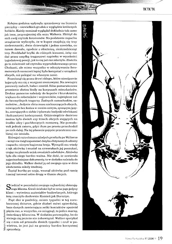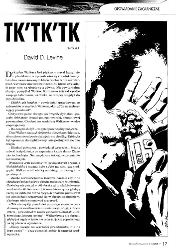 13.1. Рассказ американского писателя Дэвида Левина/David D. Levine, который называется “Tk’tk’tk” (2005, “Isaak Asimov’s Science Fiction Magazine”, March; 2008, авт. сб. “Space Magic”; 2013, ант. “Twenty First Century SF”) перевел на польский язык под тем же названием “Tk’tk’tk” РАФАЛ МОНЧИНЬСКИЙ/Rafał Mączyński (стр. 17–27). Иллюстрации МАРЦИНА НОВАКОВСКОГО/Marcin Nowakowski.