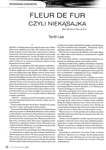 13.2. Рассказ британской писательницы Танит Ли/Tanith Lee, который называется в оригинале “Bite-Me-Not or Fleur De Fur” (1984, “Isaak Asimov’s Science Fiction Magazine”, Okt.; 1986, авт. сб. “Dreams of Dark and Light”; 1987, ант. “Vampires”), перевел на польский язык под названием “Fleur de Fur czyli niekąsajka/Fleur de Fur, или Некусайка” МИХАЛ ЯКУШЕВСКИЙ/Michał Jakuszewski (стр. 28-40). Иллюстрации ЛУКАША МЕНДЕЛЯ/Łukasz Mendel.