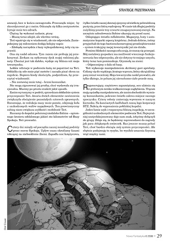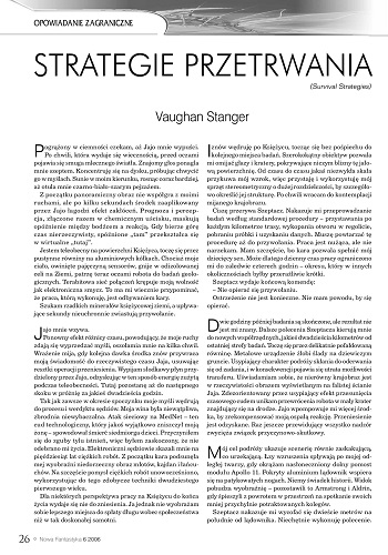 11.3. Рассказ британского писателя Вогана Стангера/Vaughan Stanger, который называется в оригинале “Survival Strategies” (2005, ”Neo-Opsis SF Magazine”, Iss. 6) перевела на польский язык под адекватным названием “Strategie przetrwania/Стратегия выживания” СИЛЬВИЯ СОСИНЬСКАЯ/Sylvia Sosińska (стр. 26—30). Иллюстрации ОЛАФА ЦИШАКА/Olaf Ciszak.