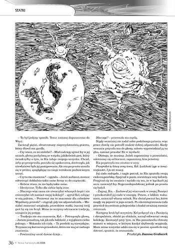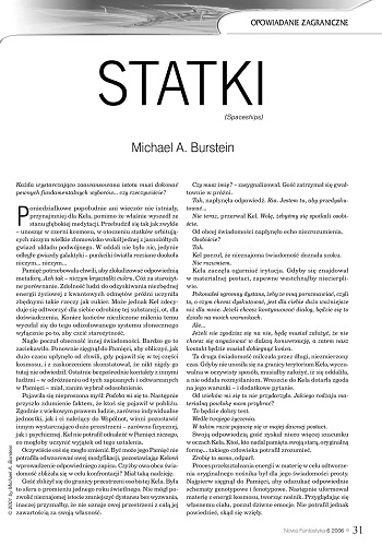 11.4. Рассказ американского писателя Майкла Бурштейна/Michael A. Burstein, который называется в оригинале “Spaceships” (2001, ”Analog Science Fiction and Fact”, June; 2008, авт. сб. “I Remember the Future: The Award-Nominated Stories of Michael A. Burstein”) перевела на русский язык под адекватным названием “Statki/Корабли” ИОАННА ГРАБАРЕК/Joanna Grabarek (стр. 31—36). Иллюстрации МАРЦИНА КУЛАКОВСКОГО/Marcin Kułakowski.