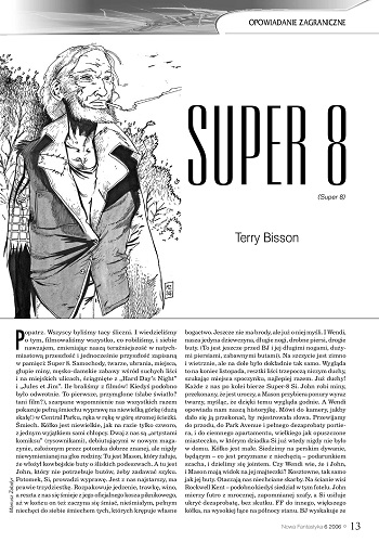 11.1. Рассказ американского писателя Терри Биссона/Terry Bisson, который называется в оригинале “Super 8” (2004, “Sci Fiction”, 24 ноября [webzine]; 2005, авт. сб. “Greetings”) перевела на польский язык под тем же названием “Super 8/Супер 8” АННА ДОРОТА КАМЕНЬСКАЯ/Anna Dorota Kamieńska (стр. 13-22). Иллюстрации МАРИУША ЗАБДЫРА/Mariusz Zabdyr.