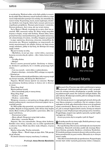 11.2. «Почти чистый horror» (Павел Матушек) американского писателя Эдварда Морриса/Edward Morris, который называется в оригинале “Hair of the Dog/Собачья шерсть” (2007, ”Murky Depts”, Dec.; 2011, авт. сб. “Shock Theatre: Collected Speculative Fiction. 2002—2006”) перевел на польский язык под измененным названием “Wilki między owce/Волки среди овец” РАФАЛ МАЧИНЬСКИЙ/Rafał Maczyński (стр. 22—25). Иллюстрации МИХАЛА ПШЕДЛЯЦКОГО/Michał Przedlacki.