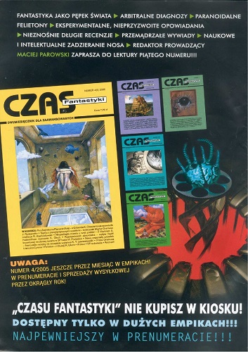 В оформлении лицевой стороны передней обложки использована работа американской писательницы и художницы УРСУЛЫ ВЕРНОН/Ursula Vernon. На внутренней стороне передней обложки напечатана реклама подписки и продажи журнала “Czas Fantastyki” (вышли из печати уже 5 номеров).