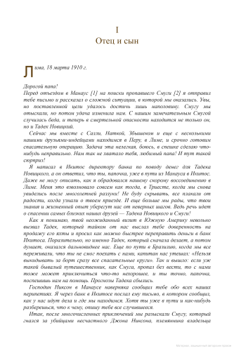 Хотя эта книгу опубликована спустя двадцать лет после предыдущей, они удивительно похожи по стилю. Все, что есть и хорошего, и плохого в «Томеке у истоков Амазонки», также можно найти здесь. Язык автора, кажется, несколько улучшился, а вот многословие нисколько не улучшилась; это действительно его ахиллесова пята. Вокруг снова так много джунглей, что я даже не пытался отслеживать продвижение путешественников по карте, что всегда является плохим знаком для меня. Относительно интересны сцены, происходящие в «лоне цивилизации», связанные с революцией, паспортной ситуацией и т.д. Относительно...