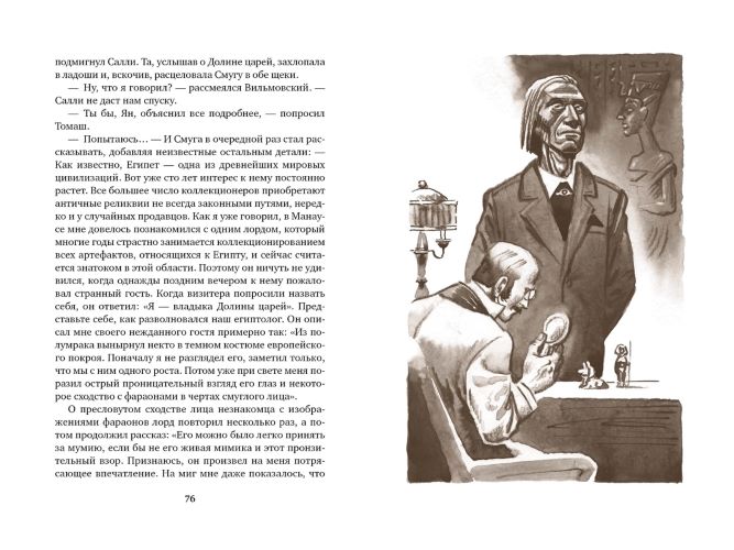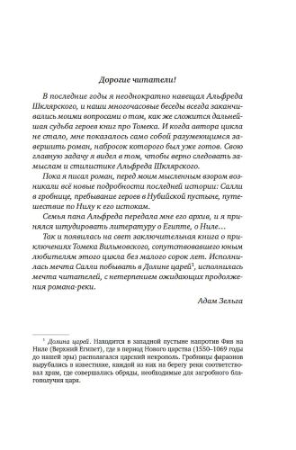 «Вот и прочитан последний роман из серии “Приключения Томека Вильмовского”. Это девятая книга цикла, издана уже после смерти автора и доработана другим писателем. Но стиль и особенности сюжета, присущие А. Шклярскому, сохранились. Так что, эта книга не выбивается из общего ряда романов про приключения компании поляков. Где они только не побывали! Теперь судьба занесла героев в Египет. Приключения поляков чем-то схожи с историями про Индиану Джонса. Пирамиды, грабители гробниц, работорговцы. Рассказывается история Древнего Египта, арабской Африки. География, история перемешаны с остросюжетной беллетристикой. Все как обычно, в этой серии книг. Могу только сказать, что к девятому роману, герои мне порядком поднадоели. Книги похожи одна на другую, меняются только декорации. А в основе сюжета, один или несколько персонажей попадают в беду, остальные их выручают. Тем не менее, роман хороший, но ориентирован на подростков» (sergej210477, FANTLAB).