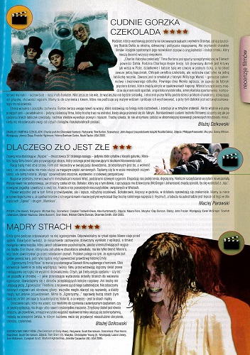 7. В рубрике «Рецензии кинофильмов» Блажей Дзиковский рецензирует фильмы “Charlie and the Chocolate Factory” (реж. Тим Бертон, США, 2005) и “The exorcism of Emily Rose” (реж. Скотт Дерриксон, США, 2005), а Мацей Паровский – фильм “The Island” (реж. Майкл Бей, США, 2005) (стр. 72).