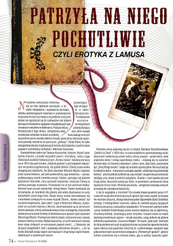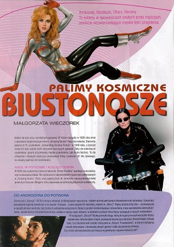 1. Итак, эротика в НФ и Ф. Открывает журнал статья Малгожаты Вечорек/Małgorzata Wieczorek “Palimy kosmiczne biustonosze/Жжем космические бюстгалтеры” (стр. 2—4) – о месте женщины в романах, написанных мужчинами и в фильмах, поставленных ими же, родимыми. Мы к ней вернемся.
