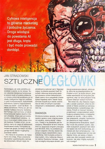 1. Темой месяца объявлено все, что связано с роботами, роботизацией, бунтом роботов и т.д. и т.п. Поэтому, вероятно, чтобы создать соответствующий настрой, первый же материал в этой новой рубрике «Тема месяца» носит название “Sztuczne półgłówki/Искусственные полудурки”. Автор этой статьи, научный обозреватель журнала “Wprost”Ян Страдовский/Jan Stradowski, полагает, что ИИ (Искусственный Интеллект) к настоящему времени добрался до как раз до обозначенного в заголовке интеллектуального уровня (стр. 3—4).