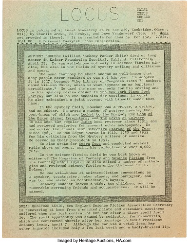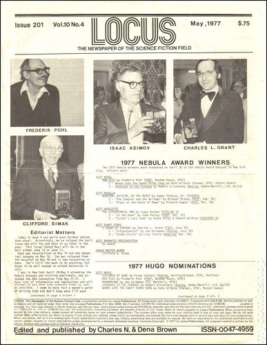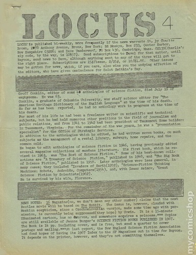 Пример “New Worlds” характерен – многие фэнзины в результате (иногда многолетнего) развития поднимались на профессиональный уровень. Всем известным ныне журналом, прошедшим этот путь, является “Locus”, считающийся сейчас одним из важнейших критических журналов, посвященных фантастике – а начинался он в 1968 году как скромный фэнзин, листок бумаги формата А4, покрытый печатным текстом с обеих сторон. Что интересно – с самого начала и по сей день его главным редактором выступает Чарльз Браун/Charles N. Brown.