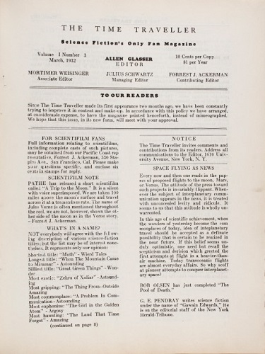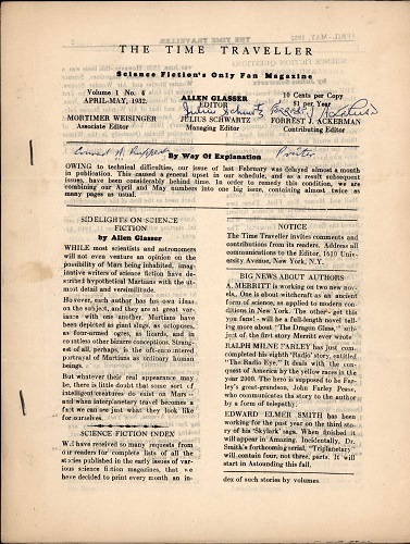 Оба были посвящены прежде всего занимательным научным фактам (хотя второй содержал также обзор профессиональных журналов НФ). Некоторые знатоки считают, что первым настоящим фэнзином следует признать только “The Time Traveller” (издававшийся с января 1932), редактировавшийся Джулиусом Швартцем/Julius Schwartz и Мортом Вейсингером/Mort Weisinger.