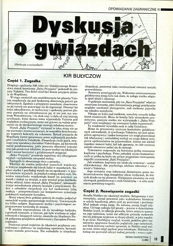 10.1. Рассказ российского писателя Кира Булычева/Kir Bułyczow, который называется в оригинале «Дискуссия о звездах» (1988, “Литературная Россия”, 39; 1990, авт. сб. “Апология”; 1995, авт. сб. “Обозримое будущее”; 2000, авт. сб. “Миры Кира Булычева: Разум для кота”), перевела на польский язык под адекватным названием “Dyskusja o gwiazdach/Дискуссия о звездах” ЕВА СКУРСКАЯ/Ewa Skórska (стр. 13—17). Иллюстрации МАГДАЛЕНЫ ЕНДЖЕЙЧАК-НАЛЯЗЕК/Magdalena Jędrzejczak-Nalazek. И это единственная публикация рассказа на польском языке.