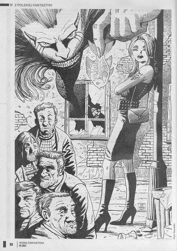 9. «Жуткий» рассказ американского писателя Рэя Брэдбери/Ray Bradbury, который называется в оригинале “The One Who Waits” (1949, “Arkham Sampler”, Summer; 1964, авт. сб. “The Machineries of Joy”; 1980, авт. сб. “The Stories of Ray Bradbury”), перевел на польский язык под названием “Ten który czeka/Тот, который ждет” МАРЕК НОВОВЕЙСКИЙ/Marek S. Nowowiejski (стр. 33-35). Иллюстрация АРТУРА СИТНИКА/Artur Sitnik.