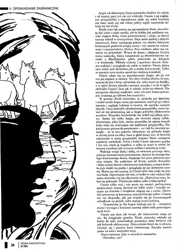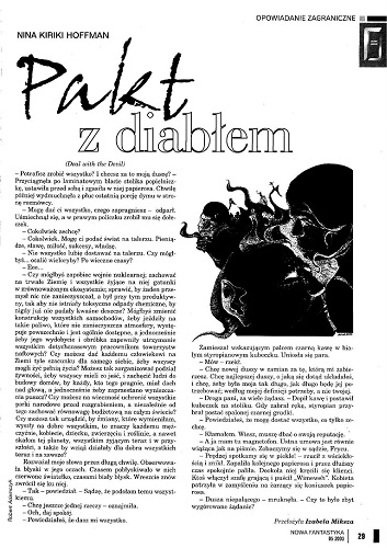 Коротенький рассказ американской писательницы Нины Кирики Хоффман/Nina Kiriki Hoffman, который называется в оригинале “Deal with the Devil” (1993, ант. “Betcha Can’t Read Just One”), перевела на польский язык под названием “Pakt z diablem/Сделка с дьяволом” ИЗАБЕЛЯ МИКША/Isabela Miksza (стр. 29). Иллюстрация РОБЕРТА АДАМЧИКА/Robert Adamczyk.