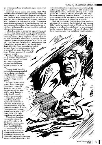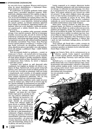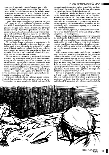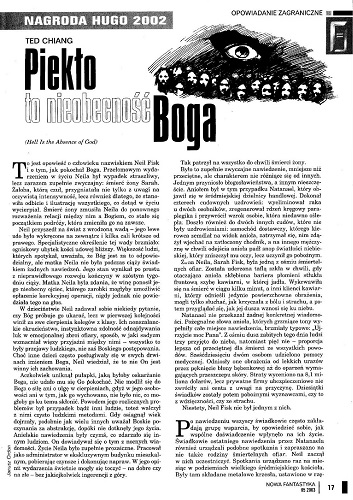 Рассказ американского писателя Теда Чана/Ted Chang, который называется в оригинале “Hell is the Absence of God” (2001, ант. “Starlight 3”; 2002, ант. “Fantasy – The Best of 2001”; 2002, авт. сб. “Stories of Your Life and Others”), перевел под названием „Piekło to nieobecność Boga/Ад – это отсутствие Бога” МИХАЛ ЯКУШЕВСКИЙ/Michał Jakuszewski (стр. 17—28). Иллюстрации ЯНУША ОРДОНА/Janusz Ordon.