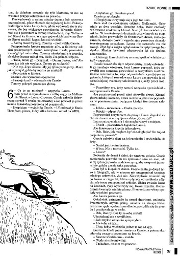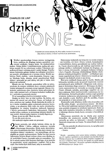 Рассказ канадского писателя Чарльза де Линта/Charles De Lint, который называется в оригинале “Wild Horses” (1997, ант. “Tarot Fantastic”; 1998, ант. “The Year’s Best Fantasy and Horror – 11”; 2002, авт. сб. “Moonlight and Vines”) перевела на польский язык под названием “Dzikie konie/Дикие кони” ИЗАБЕЛЯ МИКША/Isabela Miksza (стр. 30—39). Иллюстрации КШИШТОФА ГАВРОНКЕВИЧА/Krzysztof Gawronkiewicz.