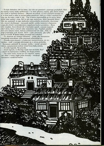 «Случилось однажды так, неведомо почему — я вдруг очутилась в очень странном селении. Но в конце концов в снах всякое может случиться. Селение располагалось над бурным серебристым речным потоком, на его восточном берегу, обозначенном светлыми голышами, и было отгорожено от остального мира стенами долины, заросшими кустарником. На волнистом склоне стояли почти вплотную друг к другу около сотни одинаковых стандартных домиков. Среди них выделялась лишь пятерка чуть более высоких домов, огороженных высокими живыми изгородями и затененных старой лещиной. Несмотря на тесноту, эта пятерка домов казалась одинокой, беспощадно отличавшейся от остальных. Домики были одноэтажными, слегка просмоленными и в то же время безупречно чистыми, будто только что покрашенными. Эти пять домов, согласно легенде, открывались только раз в году – в ночь с 13 на 14 апреля. Разумеется, как это обычно и бывает в снах, я появилась в этом селении аккурат 13 апреля…»