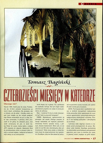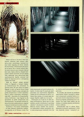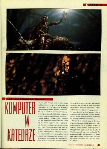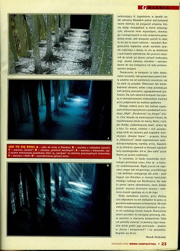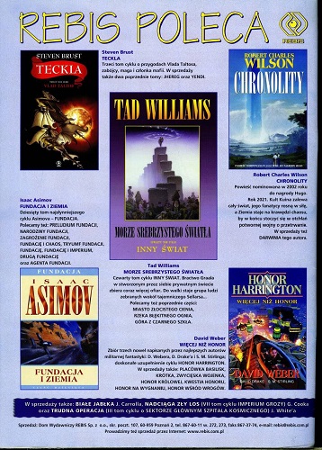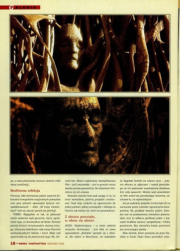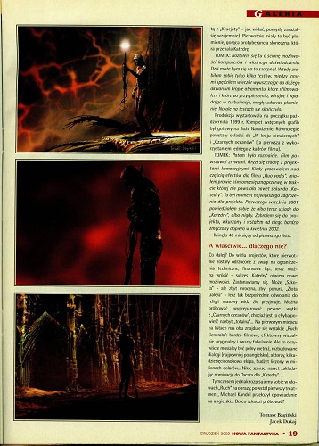 6. В рубрике «Кино и фантастика» Марек Орамус/Marek Oramus в статье “Reportaż z kosmosu/Репортаж из космоса” рассказывает о документальном фильме «Космическая станция 3 D» (реж. Тони Майерс, США-Канада) (стр. 57–58), а далее в рубрике «Фантастические саундтреки» Бартек Свидерский/Bartek Świderski описывает саундтрек Эрика Серра к фильму «Пятый элемент»(реж. Люк Бессон) (стр. 59). В рубрике «Кино и фантастика» напечатана также статья Мацея Паровского/Maciej Parowski “Przeberańcy/Ряженые” о фильмах, показанных на XVIII Варшавском международном кинофестивале (2002) (стр. 60-61).