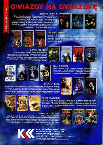 12. В списках бестселлеров за октябрь 2002 года из книг польских авторов находятся “Narrenturm” Анджея Сапковского; “Porzucone królestwo” Феликса Креса; “Kamień na szczycie” Евы Бялоленцкой; “Wilcze gniazdo” Яцека Комуды и “Czarownik Iwanow” Анджея Пилипюка; а из книг российских авторов: “Ostatni wladca pierścienia” Кирилла Еськова и “Pierestrojka w Wielkim Guslarze” Кира Булычева (стр. 78).