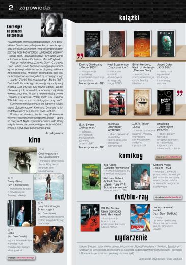 1. Под заголовком “Анонсы” напечатан список книжных, кино, DVD/BLU-RAY и комиксных премьер, его комментирует Ежи Жимовский (стр. 2).