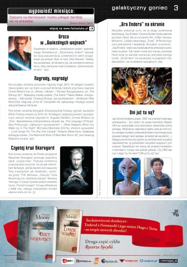 2. На следующую страничку вернулся «Галактический гонец», где речь идет о подготовке приквела к одному из романов цикла «Звездные войны», подготовке к экранизации «Игры Эндера», лауреатах премии «Хьюго» 2010 года, лауреатах премии Британской фэнтези за 2010 год, приезде в Польшу актера Александра Скарсгарда, рекламирующего сериал «Чистая кровь» и назначении в ООН спецпредставителя по связи с космитами (стр. 3).