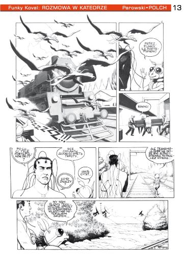 5. Напечатаны дальнейшие четыре черно-белые панели нового «Фанки Коваля» (стр. 14—16). Две из них приведены ниже. Комикс называется “Strzały na Green Point/Выстрелы на Грин Пойнт”.
