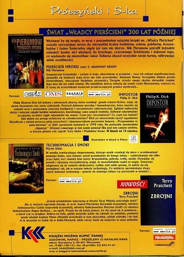 9. В заметке “Plebiscyt 2001 – wyniki!” подведены итоги читательского опроса относительно материалов, опубликованных в журнале в 2001 году. Лучшими рассказами признаны “Waniliowe plantacje Wrocława” Анджея Земяньского (№ 9), “Pociąg do Cieplego Kraju” Сергея Лукьяненко (№ 4), “Zima w Trójkącie Bermudskim” Марека Орамуса (№ 12), “Piąty peron” Анджея Валигурского (№ 11), “Śniący gatunek” Селии Фридман (№ 8) и “Trzecia księga” Войцеха Шиды (№ 8).