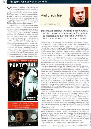 Незатейливое, радостное произведение Брюса Макдональда не лишено недостатков, один из которых особенный. Перепутаны медиа. «Понтипул» не должен быть фильмом. Более того, это наименее кинематографичное кино, которое я смотрел за долгое время. Я прекрасно могу представить тот же сюжет, разыгрывающийся на сцене театра, а самые смелые мои мысли устремляются к замыслу Уэллса. Этакий вот польский Грант Мэззи, популярный журналист или радиокомментатор, начинает бредить в эфире о странных событиях, массовых убийствах, каннибалах, взывать о помощи, и люди сходят с ума.