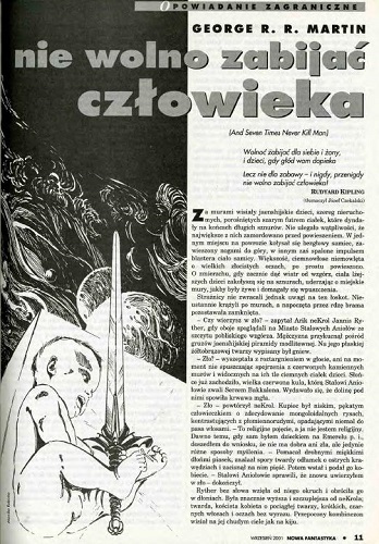 3. Небольшую повесть американского писателя Джорджа Мартина/George R.R. Martin, которая называется в оригинале “And Seven Times Never Kill Man” (1975, ”Analog”, № 7; 1977, авт. сб. “Songs of Stars and Shadows”; 1985, авт. сб. “Nightflyers”), перевел на польский язык под названием “Nie wolno zabijać człowieka/Нельзя убивать человека” МИХАЛ ЯКУШЕВИЧ/Michał Jakuszewicz (стр. 11-16; 25-34). Иллюстрации МОНИКИ РОКИЦКОЙ/Monika Rokicka.