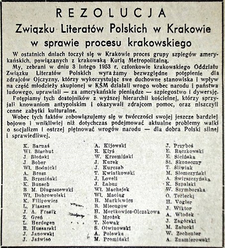 Имея к 1949 году уже несколько изданных книг, вступил в Союз польских писателей и переселился в Краков, где получил квартиру в Доме писателей на ул. Крупничей, 22 (с Барбарой Таргоньской он к этому времени уже развелся и был женат на Лидии Замков (Lidia Zamkow, 1918 – 1982) – актрисе, более известной позже как театральный режиссер). Разумеется, работники СБ не спускали с него глаз. А в январе 1953 года прочитали донос, который написал на него краковский поэт Адам Влодек (Adam Włodek, 1922 – 1986), муж Виславы Шимборской (Wisława Szymborska, 1923 – 2012; лауреат Нобелевской премии 1996 года), сосед по квартире.
