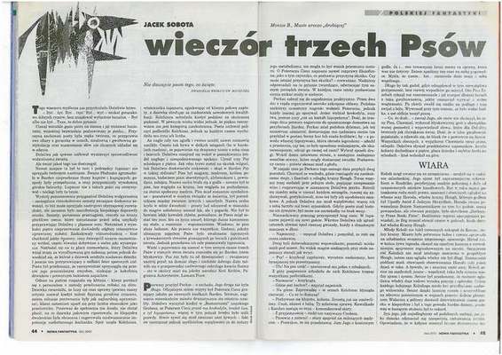 5. В рубрике «Из польской фантастики» напечатан рассказ, который называется “Wieczór Trzech Psów/Вечер Трех Собак», который написал Яцек Собота/Jacek Sobota (стр. 44-56). Иллюстрации МАРЕКА АДАМИКА/Marek Adamik. Это четвертый рассказ, действие которого разворачивается в так называемом «мортеновском мире» (см. “Cierpienie hrabiego Mortеna”,“Glos Boga”, "Bedzie cie zaliczone" – все три в нашем журнале, что легко проследить по тэгу «Собота Я.»); «постмодернистская игра, а вместе с тем и насыщенная болью философская притча о перевернутом, парадоксальном мире, еще худшем, чем наш (!?), хоть и очень на него похожем» (Мацей Паровский). Рассказ номинировался на получение премии "SFinks", позже он вошел в состав авторских сборников рассказов Соботы ”Głos boga/Глас божий” (2006) и “Wieczór Trzech Psów/Вечер Трех Собак» (2016).