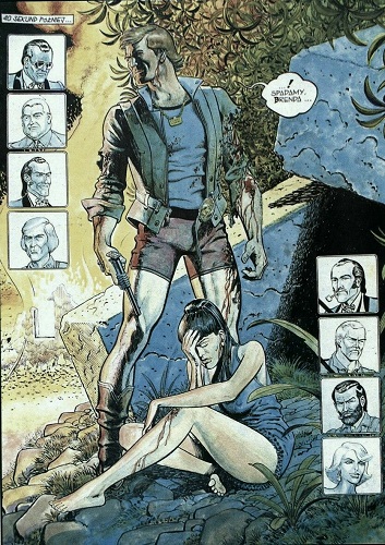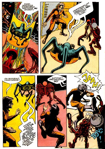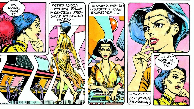 Мацей Паровский: Откровенно говоря, западные комиксы хорошо знал только ПОЛЬХ. Мы с Яцеком о комиксах мечтали; помню, что где-то за год до того, как мы взялись за эту работу, я побывал в Париже и там наткнулся на длиннющий прилавок с комиксами и увидел, чем этот самый комикс может быть. Не “Подпольным фронтом” или “Капитаном Клоссом”, но великолепным изысканным графическим приключением в тысяче конвенций, с развитием тысячи мотивов, в тысяче фантастических миров. Разумеется, я пришел в восхищение. Мы, когда писали <сценарий>, когда делали этот комикс, хотели исполнить собственные мечтания, соблюсти собственные критерии комикса со значительным, непредсказуемым, запутанным и бунтарским сюжетом. Трое парней, не жалея времени, сочиняли и не чувствовали себя одинокими – нам покровительствовала очень богатая сокровищница фантастических произведений. Из этой сокровищницы мы брали различные коды, ситуации, возможности. Ведь это не случайность, что так много молодых людей дебютирует в фантастическом жанре, потому что этот жанр их ждет – ждет молодых впечатлительных людей, которые хотят что-то сказать. У них нет жизненного опыта, но они уяснили себе конвенцию и работают в ее рамках, а затем эти рамки раздвигают, модифицируют. Ведь это неверное утверждение, что все книги, все сценарии должны быть написаны семидесятилетними стариками, которые знают все о жизни, науке и вселенной. Нам сильно повезло, мы хорошо подошли друг к другу, были смесью именно таких составляющих, какие требовались. То же самое было с моей функцией редактора – я не вылетел из журнала через год или два, потому что со своим характером подходил для должности руководителя отдела польской прозы, потому что я любил своих авторов, быстро осознал, что они лучше меня и не вступал с ними в состязание. Это ужасно, когда редактор завидует автору или начальник научного учреждения завидует сотруднику, изобретшему нечто новое. Комикс, фантастика и журнальный отдел польской прозы – это великое приключение по моей мерке. Я знаю великих авторов, которые не годятся для редакторской работы, попросту не обладают предрасположенностью к этому, а написали много больше книжек, чем я. Но ни один из них, кроме Орамуса, не занимался так много критикой, которая заботливо склоняется над авторами, над их творениями. То есть я стерег свое корыто, и я люблю свое корыто».