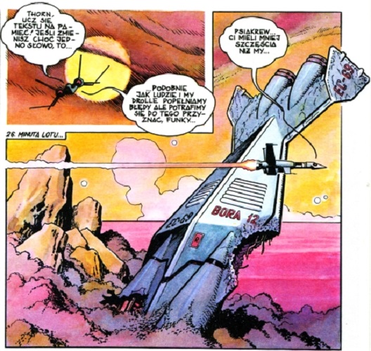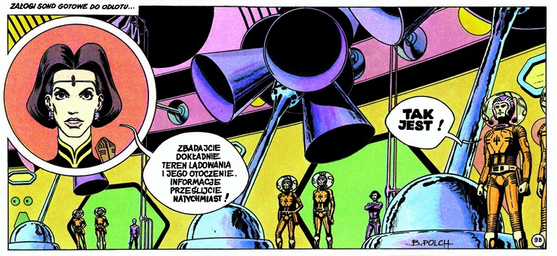 Богуслав Польх: Поначалу он пытался требовать, чтобы я точно следовал его сценариям. Я не пошел на это, потому что, хотя Мостович был интеллектуалом и эрудитом, но некоторые его замыслы были устаревшими и им не было места в научно-фантастическом комиксе. Например, он расписывал сцену, в которой герой взбегал по ступенькам лестницы в другое помещение, чтобы передать некую информацию. Я же рисовал каждому из действующих лиц коммуникатор на руке и клипсу-приемник в ухе. Мир становился более правдоподобным и действие не замедлялось.
