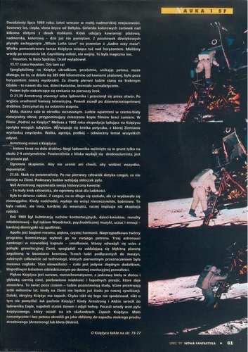 11. В рубрике «Среди фэнов» размещены отчеты Кшиштофа Химковского-младшего/Krzysztof Chimkowski jr об очередной (апрельской) встрече с читателями в варшавском WOK, где шла речь о творчестве Станислава Лема (стр. 64-65), и Гжегожа Щепаняка/Grzegorz Szczepaniak о т.н. «блуждающем коне любителей фантаcтики» (“Arracon’99, 30.04-03.05 в Эльблонге) (стр. 65).