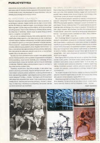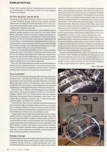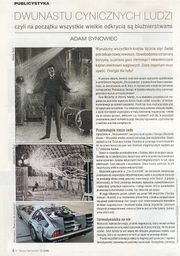 2. В рубрике «Публицистика» напечатана статья Адама Сыновца/Adam Synowiec “Dwunastu cynicznych ludzi czyli na początku wszystkie wielkie odkrycia są bluźnierstwami /Двенадцать циников, или Поначалу все великие открытия это кощунства” (стр. 4–6). Заголовок – цитата (м.б. чуточку переиначенная) из Джорджа Бернарда Шоу – «Все великие истины начинались как кощунства». Генератор ирландской фирмы “Steorn” который работает неизвестно на чем (не требует горючего), нарушая законы термодинамики. Никола Тесла и его таинственные изобретения. Автомоторы, работающие на этаноле (BioPower Hybrid концерна General Motors и другие). Паровой двигатель Inspiration и другие. Магнитные двигатели Парандева, Уолтера Торбэя, Лесли Снайдера, Вячеслава Струщенко, Говарда Джонсона, К. Минато.
