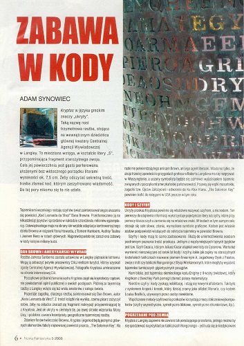 3. В рубрики “Publicystyka” напечатана статья Адама Сыновца/Adam Synowiec “Zabawa w kody/Игра в коды” (стр. 7—8). О принципах и практике кодировки и шифровки тайных сообщений (Юлий Цезарь в письме к Цицерону, таблички ронго-ронго, фестский диск, немецкий код “Enigma”, “Kryptos” из Лэнгли, якобы послания, заложенные во фресках, детская сказка Майкла Штадтера “A Treasure’s Trove”…)
